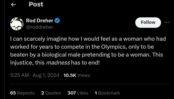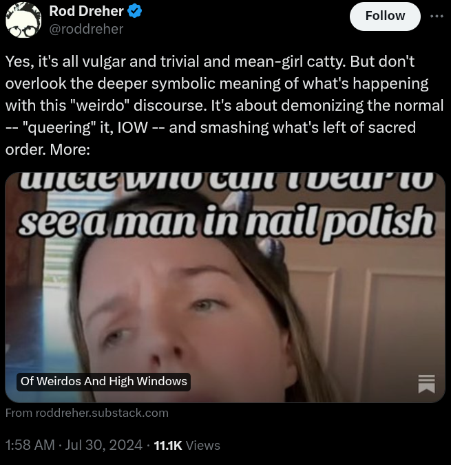 Yeah, this is a guy who had (still is?) for the past decade or so been posting to “libs of tik tok” and Andy Ngo various bizarre and self centered terminally online sexual micro-minorities, specializing in ever so exotic and meaningless pronouns. This is presented as though it is bigger than it is, and the main problem with most is a terminally online nature. His response to them is to shout that they are weird. Dhrer’s guy, meantime, does his terminally online act, spouts his mouth off for… Um… podcaster “Bronze Age Pervert”, and Dreher is horrified that some peoples outside of the political and cultural mainstream but in his direction (with certain contradictory caveats on that) are called “weird”.
