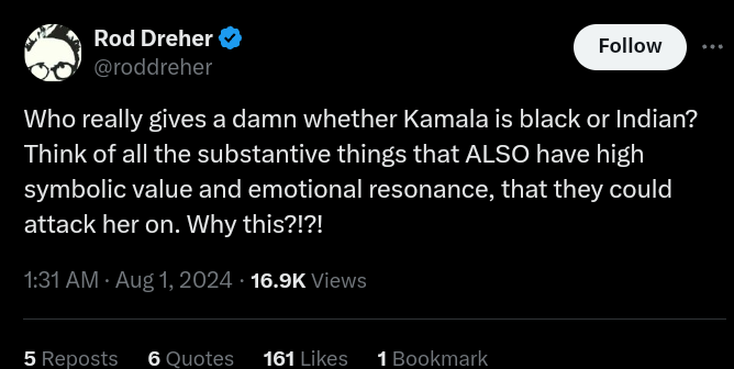 There is a limit to the “weird” line. It encompasses too much, somewhat predictably overlapping Clinton’s “Basketful of deplorables”, gets shoved into the policy matters as he lays down some absolutes. We can’t clutch too many pearls on it, going up against some clown who defenders always dismissed problems with as “mean tweets”, Bringing in early JD Vance promoter and superfan Rod Dreher to this parade: