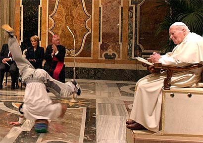 And the Pope watches someone break-dance. Why? I guess the man loves the art of break-dancing!