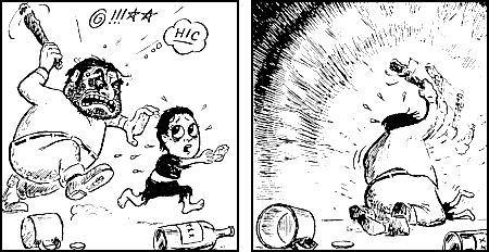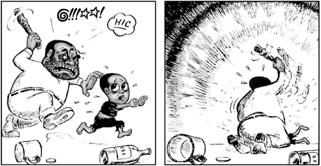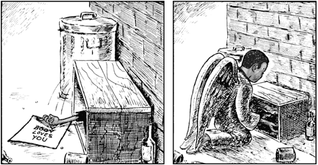 In case you’re not privy to Jack T Chick, and have never picked one out from a public telephone where the Christian Fundamentalists of a certain stripe leave them: Yes, the premise of this tract is that you have an alcoholic dad beat his kid and throw him out into a rainstorm for not bringing home enough spare change from a day’s worth of begging, where-upon the kid dies on the street, his only solace being a piece of paper that informs him that “Somebody Loves You.” A good Christian woman comes by and tells him that that “Somebody” is Jesus. In the first printings of the tract, she leaves, saying nothing else. At some point, Chick realized this doesn’t come off well, so he added the line “I’ll get you some help!” Thank you, Chick, for making this morality tale newly accessible to a multiracial audience!