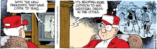 Our popular imagination of freedom in Afghanistan sort of trickles back and forth between allowances of Afghan custom and visions of burka-less mini-skirt regalia. (Note: I linked to the first site google shows when doing a quick search for how we’re assimilating our visions of Afghanistan.) Iraq is not Afghanistan — only in the 1990s under sanctions did it devolve into a third world economy, but the essential point of equating whatever the heck we’re wearing as the end all and representation of “Freedom” ™ holds forth nonetheless.