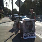 At the corner of Wall Street and Ivanhoe Avenue, political activists are asking La Jolla residents and visitors to impeach the President, showing two pictures of Obama: one with a mustache and the other, in a straight jacket.