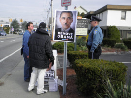 The two did say they had not asked permission from the Dunkin’ Donuts owner to be in front of store, and the police told them the display did not violate any ordinance. They did make them move one sign which was impeding traffic. The men were accepting donations and the officer said he would have to check as to whether that was a violation. The two said they were not selling anything.