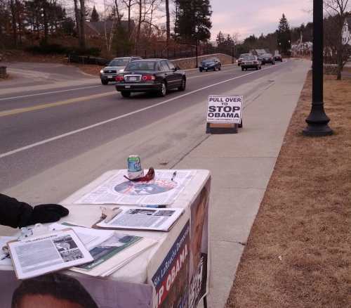 visitor. On the side of their table was the now-familiar poster of Barack  Obama with a Hitler mustache. “It’s about my freedom of expression.” Every few minutes, a passing car would honk in apparent support. When the visitor speaking with the male supporter left, I stepped forward  and introduced myself as a local blogger. I asked how business was going. Good, he said.