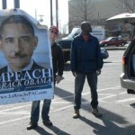 These people remind me of the group I saw on the street today. There was a huge sign with a picture of Obama with a little Hitler-musÂtache painted on and “Impeach Obama” to one side in large letters. When I approached I could see this was set up by the La Rouchies.