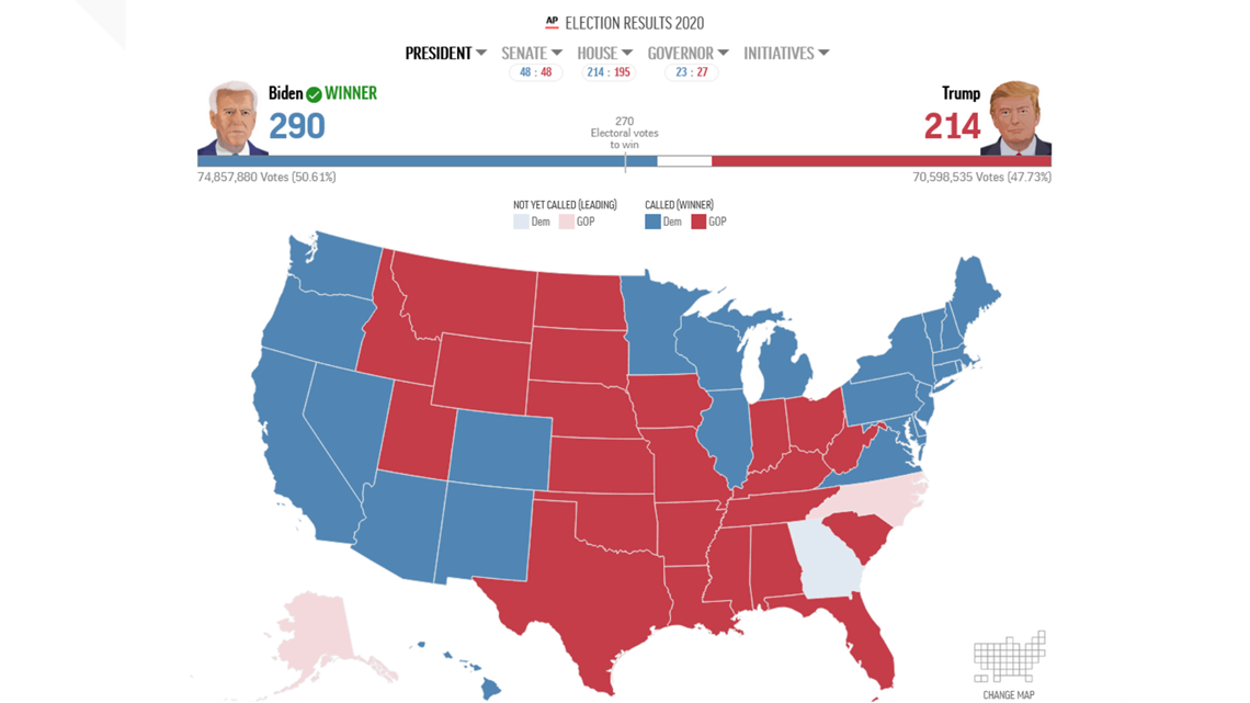 Now, fill in the light reds and light blue — the vote tally is not about to change. And there is one inaccuracy not filled — there needs to a snatch of blue in Nebraska, and the red for bulk of physical Maine — perhaps the redistricters in Nebraska will think of this stray electoral vote in redrawing for partisan purposes, or perhaps they will remain wrary of depositing Democratic votes in the other districts.