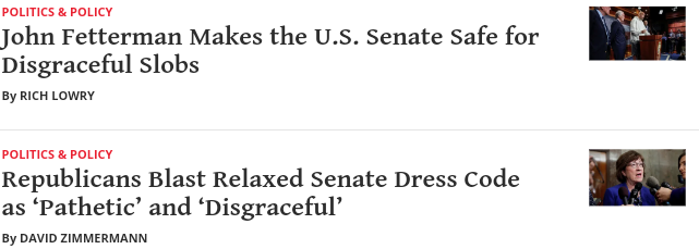 You have this reasonable enough point of contention against the relaxing of dress codes in the Senate chamber and the obvious culprit number one — Pennsylvania Senator John Fetterman. The issue comes in as partisan due to both low level ideology — “Conservative” finally has a goddamned meaning — and the matter of who is driving in to take advantage of the loose dress code — a Democrat that Republicans routinely whip up on. I can’t say if it is wholly partisan and what would have happen if the sides were reversed or if that were possible — hypothetical Republicans would have to be desiring accommodation of a populist riding star’s dress eccentricities for the basic ideological issue to be uprooted, and for the Democratic opposition I am immediately remembering the furor that greeted President Trump’s ketchup and well done steak eating habits.