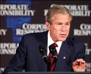 Here, spokesperson Bush is introducing the new product "Corporate Responsibility". Or, maybe Bush Administration is merging with "Corporate Responsibility"?