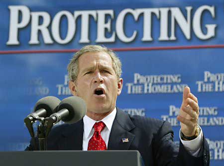 Every day, President George Bush, spokesperson for Bush Administration, stands behind a platform and in front of a wall of slogans.